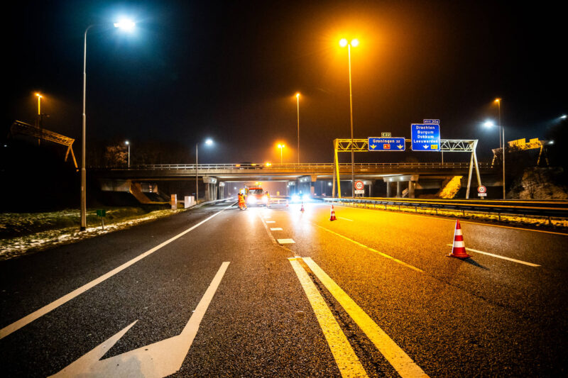 DRACHTEN – Vrijdagavond werd er een spoedreparatie uitgevoerd op de A7 net na het viaduct bij het klaverblad in Drachten. Door het opdooi was het wegdek beschadigd geraakt, waardoor een gat in het asfalt was ontstaan.