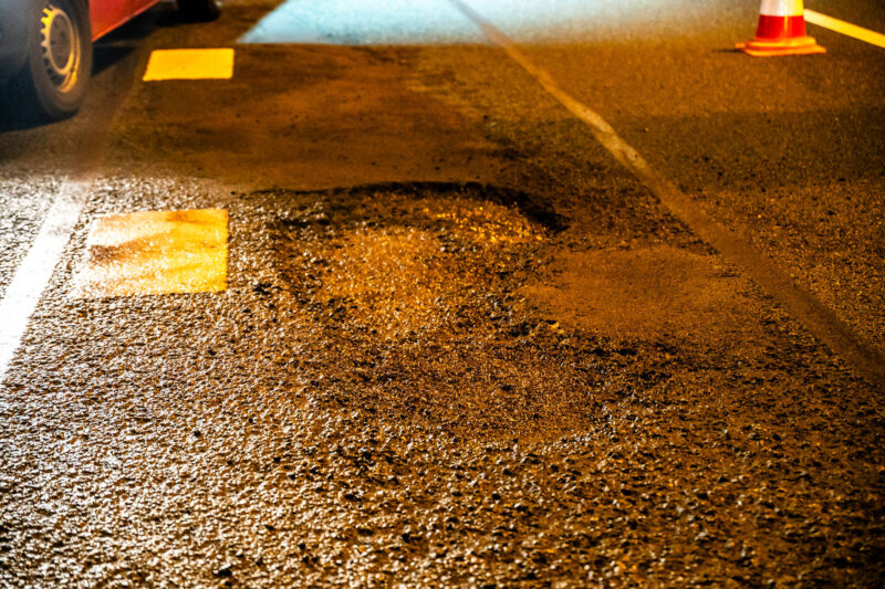 Wegwerkers waren bezig met het herstel. Op de rechterrijbaan werd nieuw asfalt aangelegd, terwijl de linker rijstrook open bleef voor verkeer.