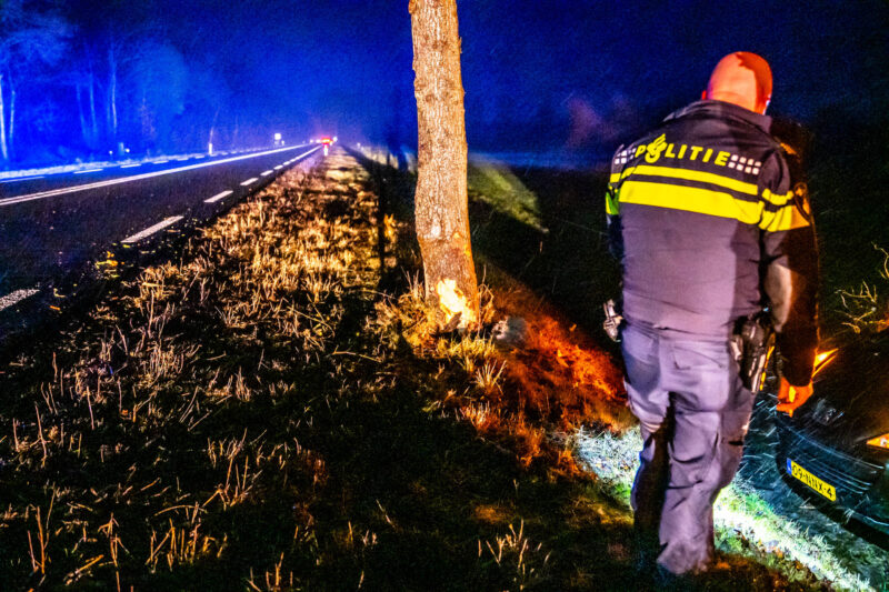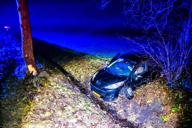 De auto botste tegen een boom en kwam uiteindelijk tot stilstand in een greppel naast de weg. Hulpdiensten, waaronder de politie, kwamen ter plaatse om assistentie te verlenen en de situatie veilig te stellen.