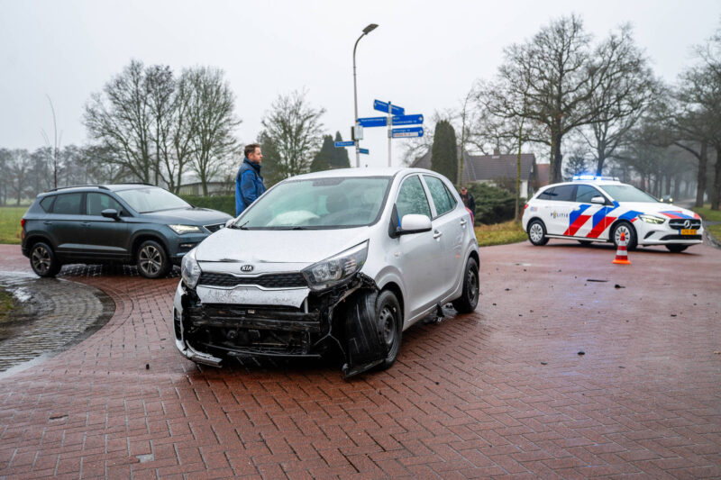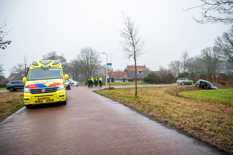 Op het kruispunt vond een botsing plaats tussen twee voertuigen. Door de klap raakte één van de auto’s van de weg en belandde in een greppel naast het kruispunt.