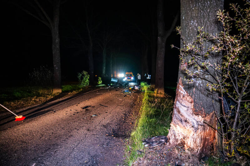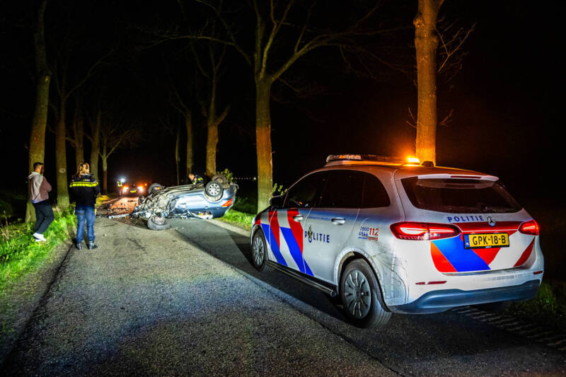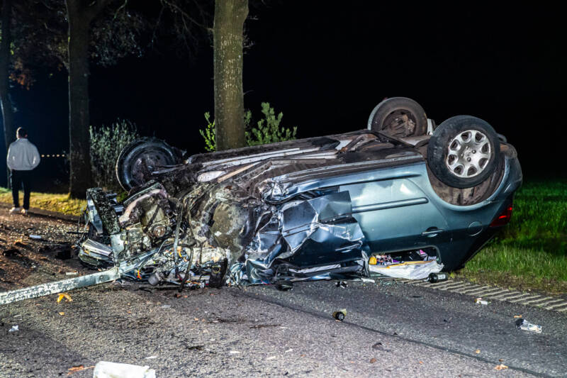 Ter plaatse bleek een auto tegen een boom te zijn gebotst, waarna het voertuig werd gelanceerd en over de weg toldde. De auto kwam uiteindelijk op de kop tot stilstand op het wegdek. De ravage was groot: meerdere onderdelen van het voertuig kwamen verspreid over de weg terecht.